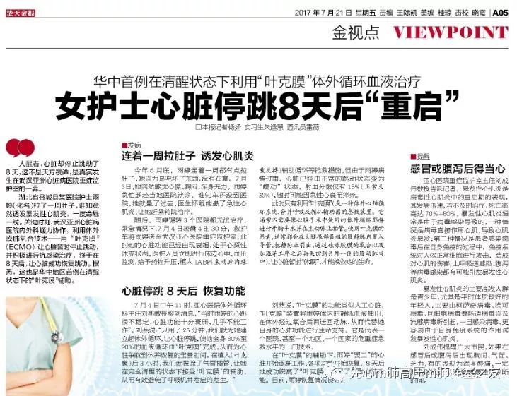 仅仅心律失常,三度房室传导阻滞时,可以通过安装临时起搏器带动心脏工作。但如果心肌严重受损,收缩力严重下降心脏不再跳动的情况下,我们必须用上ECMO---一个代替心脏工作的机器。