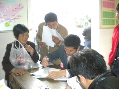 我院社会服务部人员(中)帮助当地不会写字的老百姓填写申请表格