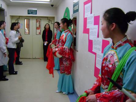 护士们组成的腰鼓队敲锣打鼓迎接评委的参观