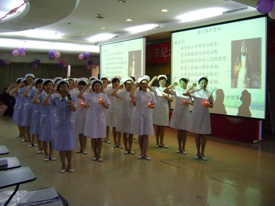 新护士授帽仪式中,我院高级护士长和新加入护士队伍的白衣天使在庄严宣誓。