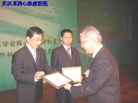 2008年,我院心外科曾祥军医生正在接受国外专家颁发“中国医师协会心血管外科菁英奖”证书