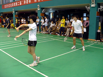 图为鈡茹英、李师亮大夫正在进行混合双打比赛