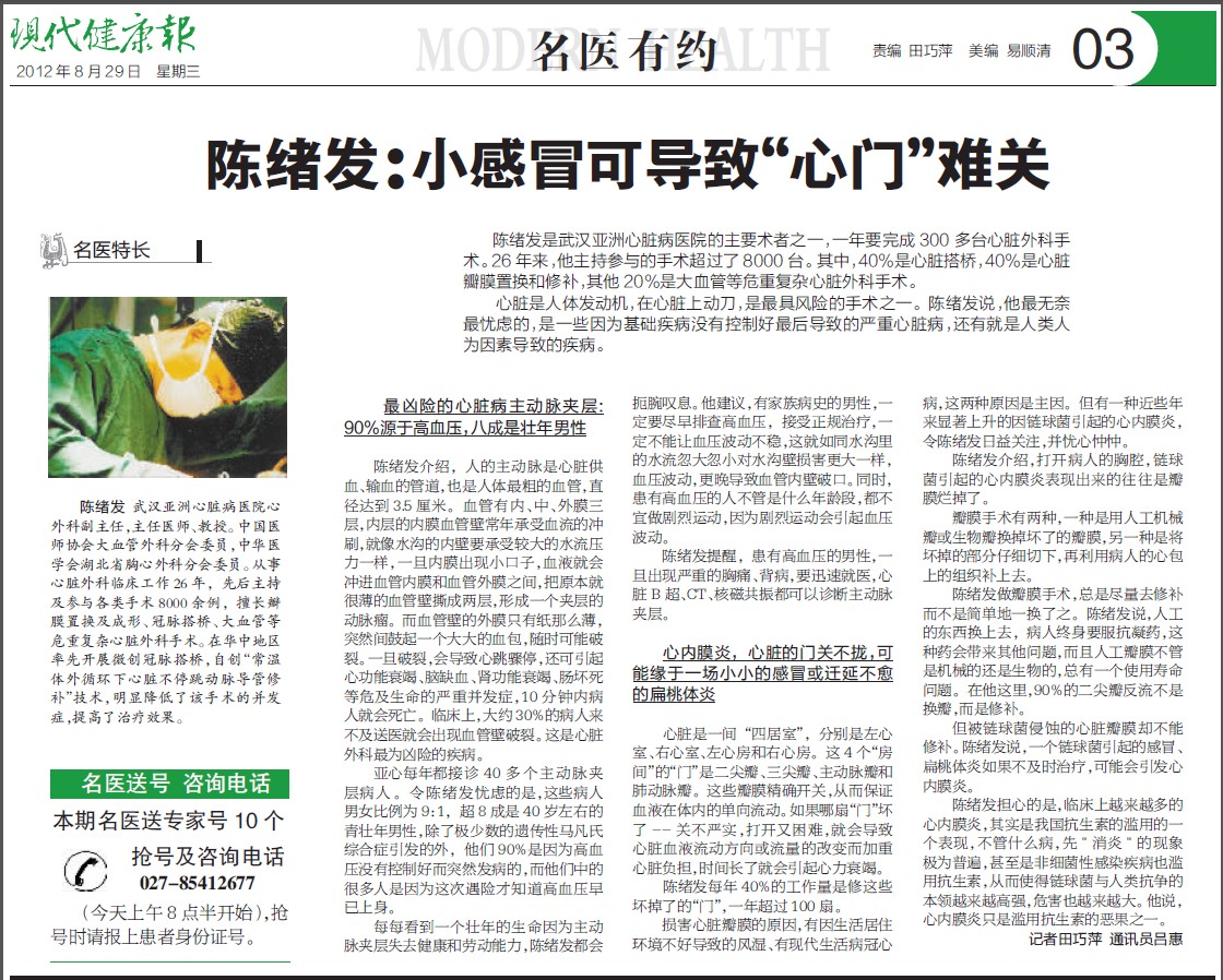 陈绪发:小感冒可导致“心门”难关:《现代健康报》