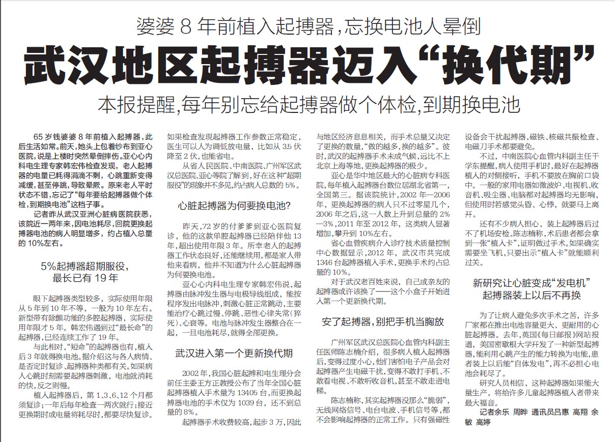 武汉地区起搏器迈入“换代期”:《武汉晚报》