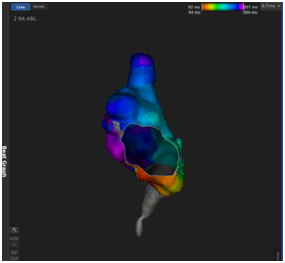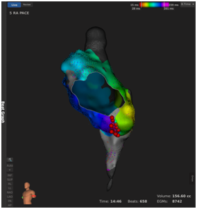 [NextPage]患者张爹爹今年60岁,患有持续房扑3年多。在心律失常专家张劲林主任主刀下,手术半小时内即完成目标心腔电生理三维标测,累计标测5万余有效信息点,标测图清晰展示出该心律失常为三尖瓣峡部依赖的逆钟向折返性房扑,明确的机制诊断为制定治疗策略提供了全面清晰的指导。三尖瓣峡部消融后,持续房扑成功终止;随后进行的起搏验证标测提示消融径线完整且达到双向传导阻滞,患者维持窦性心律,达到手术成功标准,完成手术。