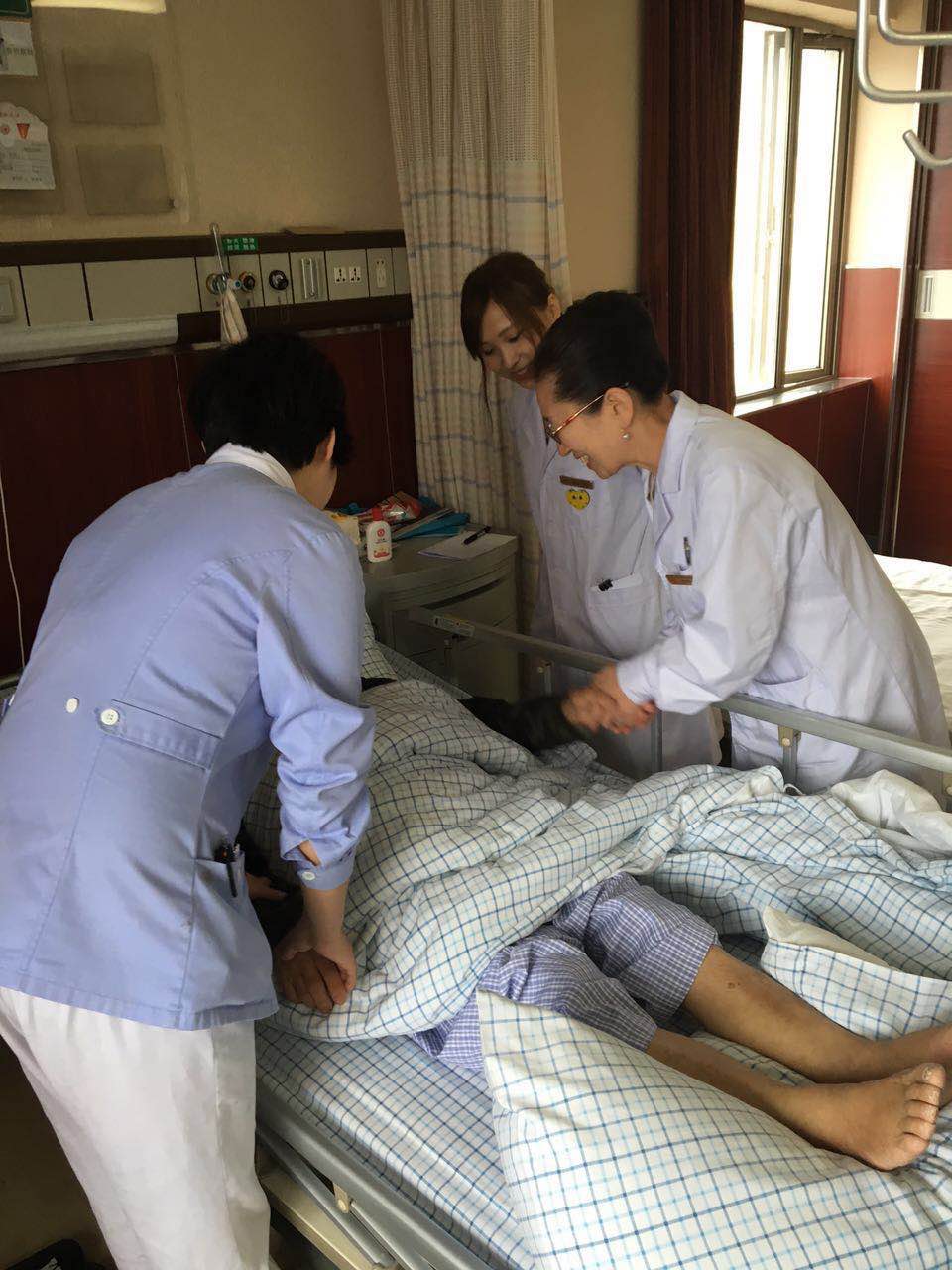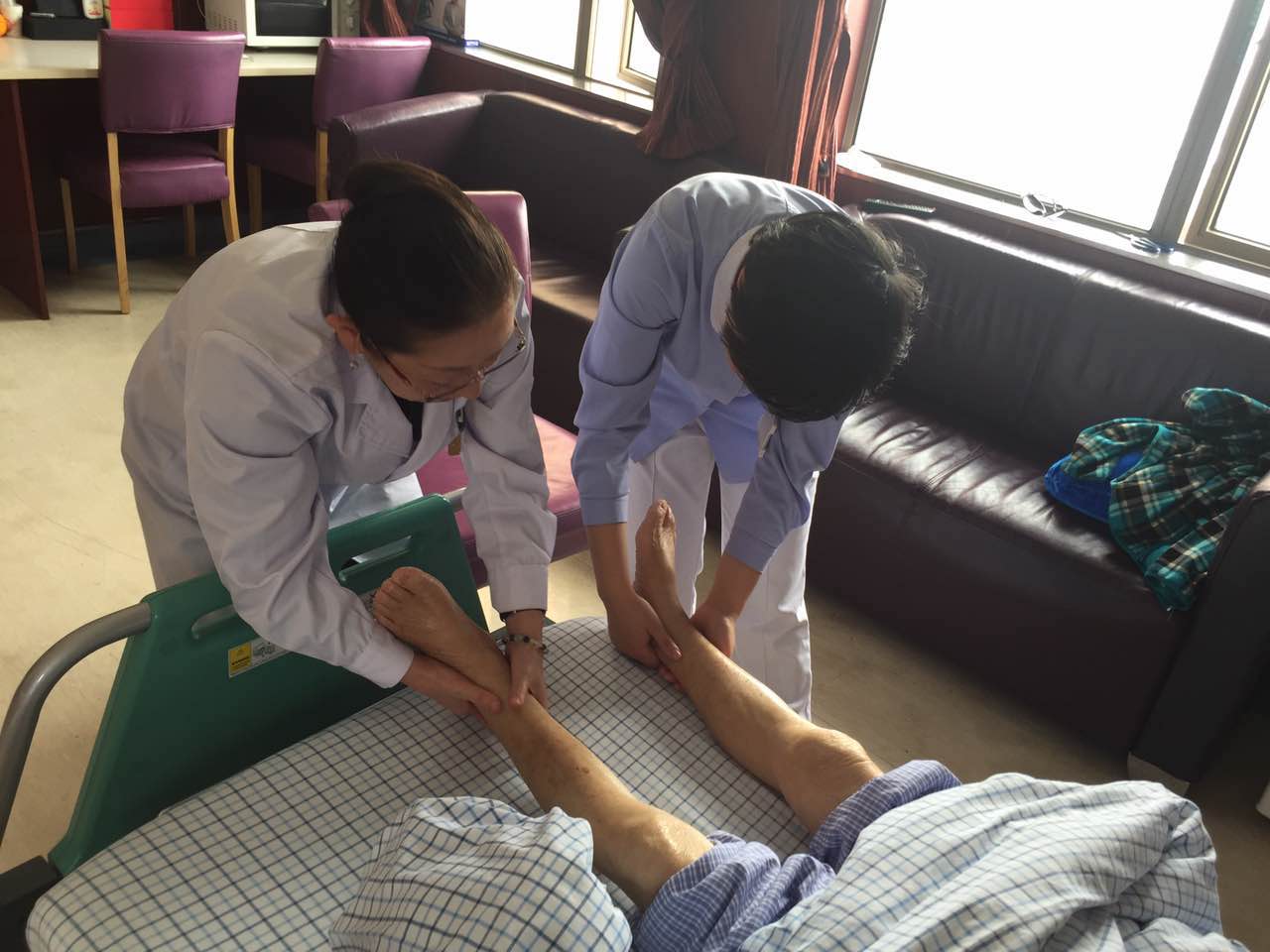 瑠美子老师告诉我们,按摩能让交感神经兴奋,组织的肌肉会放松,所有的按摩节奏要依据患者的节奏。以一秒五厘米的速度进行按摩,这个速度不急不缓,会让患者很舒服、很安心。对护理来说这个按摩方式应该是很适合这类病人的,希望我们的护士都能去这样做,这也是我们常说的人文关怀其中的一部分。当我们的人文关怀护理即将结束时,爷爷微笑着还为我们竖起了大拇指!
