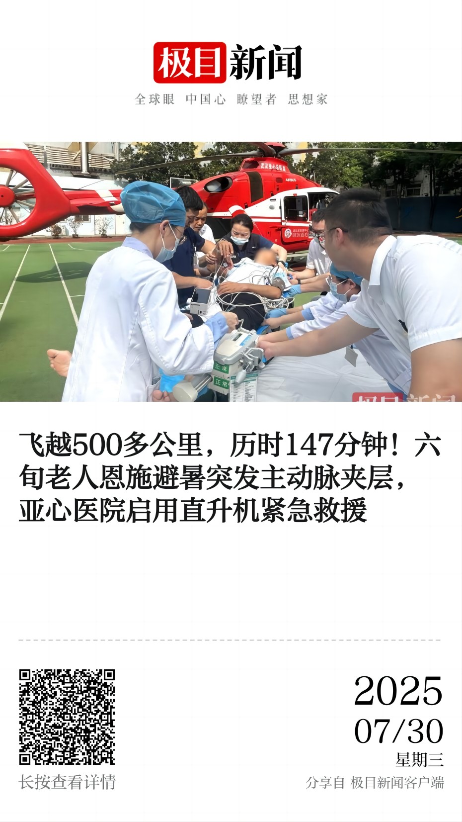 极目新闻:飞越500多公里,历时147分钟!六旬老人恩施避暑突发主动脉夹层,亚心医院启用直升机紧急救援